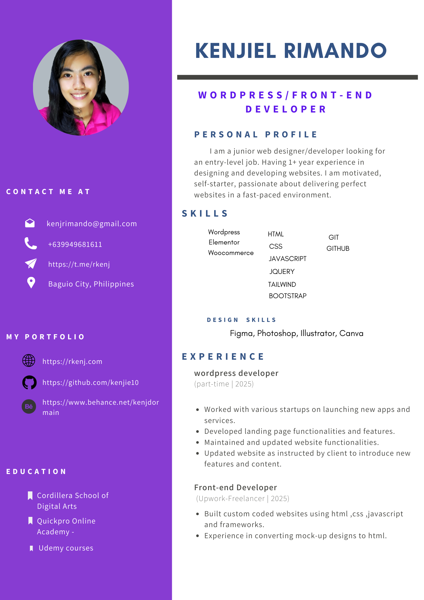A personal portfolio website built with WordPress to showcase projects, skills, and services through a clean, responsive, and easy-to-manage layout.